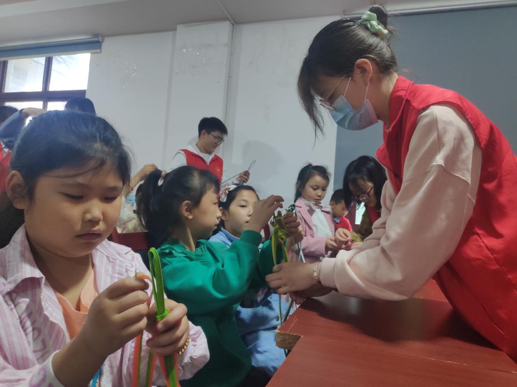 棕编是一项汉族传统手工艺品,它用易得的材料棕叶编成五彩缤纷、栩栩如生的仿动物玩具和工艺品,既保留了传统风格,又符合现代时尚潮流。课堂上,志愿者向小朋友们讲解了棕编的相关知识,讲解棕编的历史背景,传授非遗棕编的编制技法,探索非遗文化的乐趣课堂上,小朋友们观看了有关棕编的视频,积极地回答问题,并分享了自己的想法。随后,在志愿者的引领下,小朋友们开始亲手体验棕编编制的过程,志愿者们对小朋友进行一对一的指导,解决小朋友在编制过程中遇到的各种问题。最后小朋友带着自己骄傲的编制作品——各种各样的蚱蜢,与志愿者们合影留念。