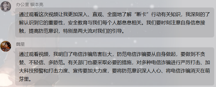 通过此视频学习,我们更要提高防范意识,切莫贪图小利、心存侥幸,非法买卖“两卡”,并积极向公安机关反诈骗中心举报涉“两卡”的违法犯罪线索,打一场打击惩戒治理非法买卖“两卡”违法犯罪活动的人民战争。————19级软件工程李绪江